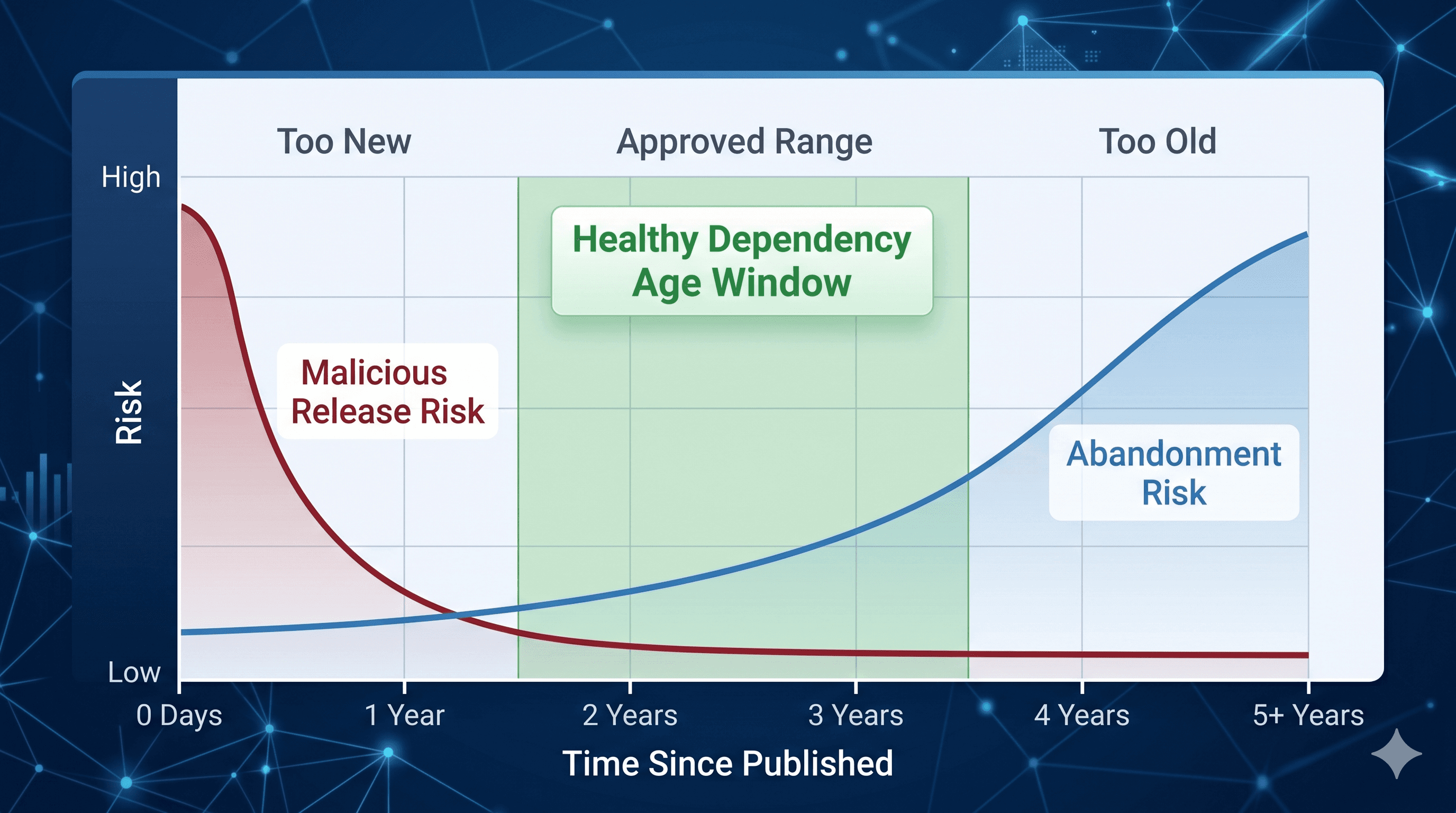 Vertical axis: risk — malicious-release risk on the left (decays over days), abandoned-project risk on the right (grows over years).