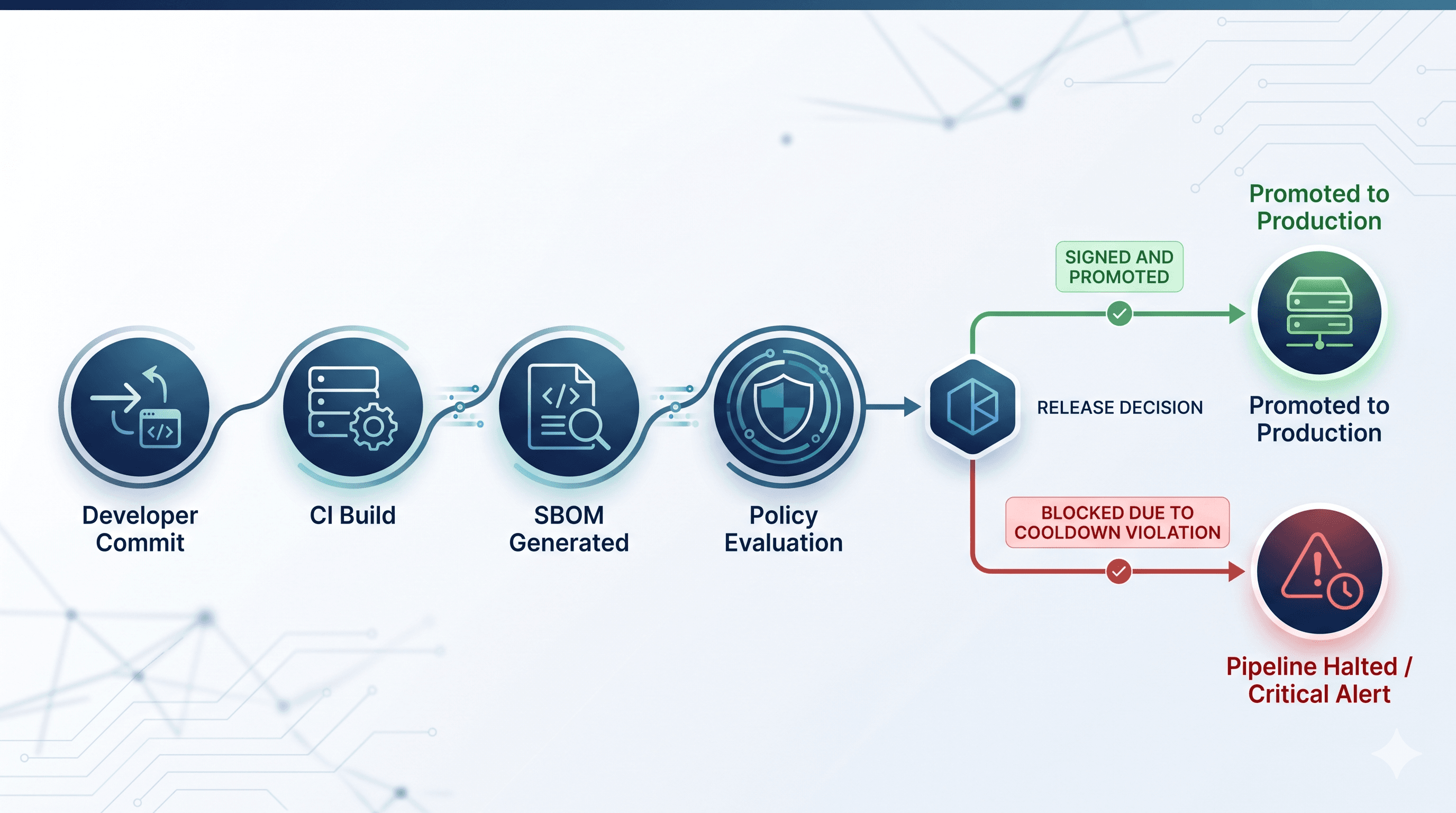 COMPONENT_PUBLISHED_AGEpolicy runs alongside every other policy (license, vulnerability, supplier, lifecycle).Violations block the release. The PR is gated, the tag is held, the container is quarantined.